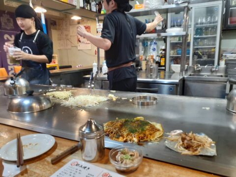 鉄板のあるコ字カウンターでお好み焼き食べるの初めてなのよ〜ビール飲んでスタンバイよ!