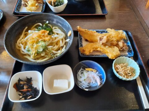 お昼ご飯は花いちりんお花教室の生徒さんAさんの上司が広島出身の方でね。教えて頂いた「小町うどん」でランチ。うどん以外のおかずやご飯が食べ放題¥740でびっくり!お客さんは近所のサラリーマン風の方々ばかりでさ〜美味しゅうございました