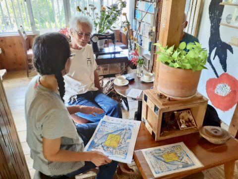 額装終わらない時にやって来たティラーさんとげんちゃん。出来立てホヤホヤ生原画を見ていただきました
