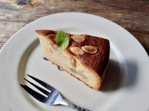 本日のケーキはフクロク亭謹製洋梨のアーモンドケーキ