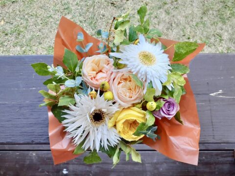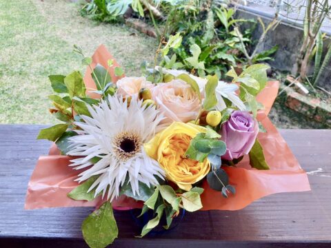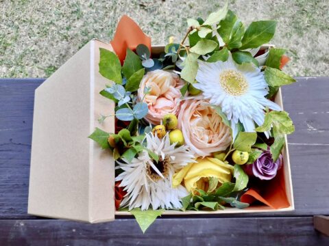 花いちりんでは生花の他に、お好みのお菓子、ドライフラワー、アクセサリー、フラワーベースをBoxやバスケットに詰めて色々な組み合わせができます。