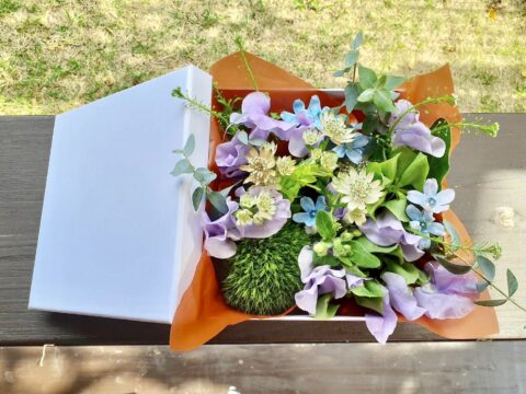 花いちりんでは生花の他に、お好みのお菓子、ドライフラワー、アクセサリー、フラワーベースをBoxやバスケットに詰めて色々な組み合わせができます。