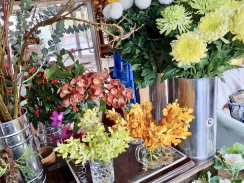 お正月らしい色味のシンピジューム、バンダ、デンファレ
