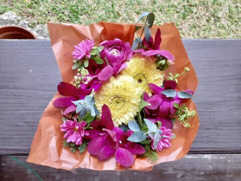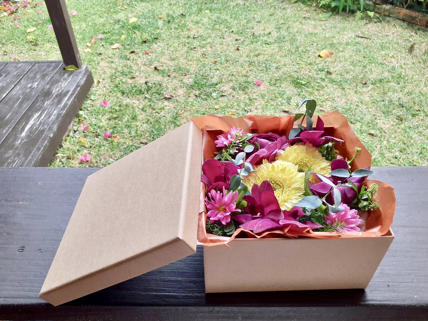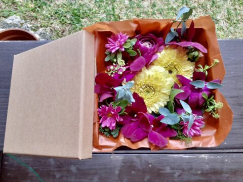花いちりんでは生花の他に、お好みのお菓子、ドライフラワー、アクセサリー、フラワーベースをBoxやバスケットに詰めて色々な組み合わせができます。