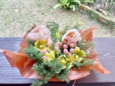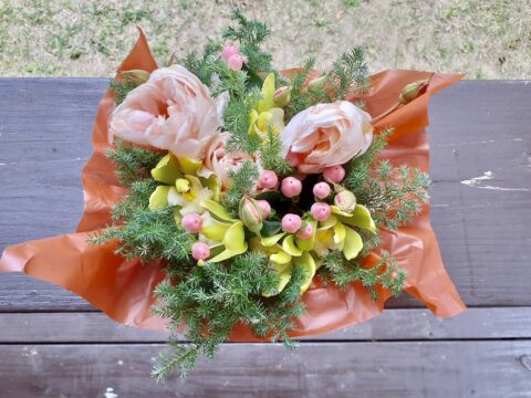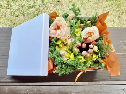 花いちりんでは生花の他に、お好みのお菓子、ドライフラワー、アクセサリー、フラワーベースをBoxやバスケットに詰めて色々な組み合わせができます。