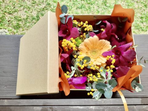 花いちりんでは生花の他に、お好みのお菓子、ドライフラワー、アクセサリー、フラワーベースをBoxやバスケットに詰めて色々な組み合わせができます。