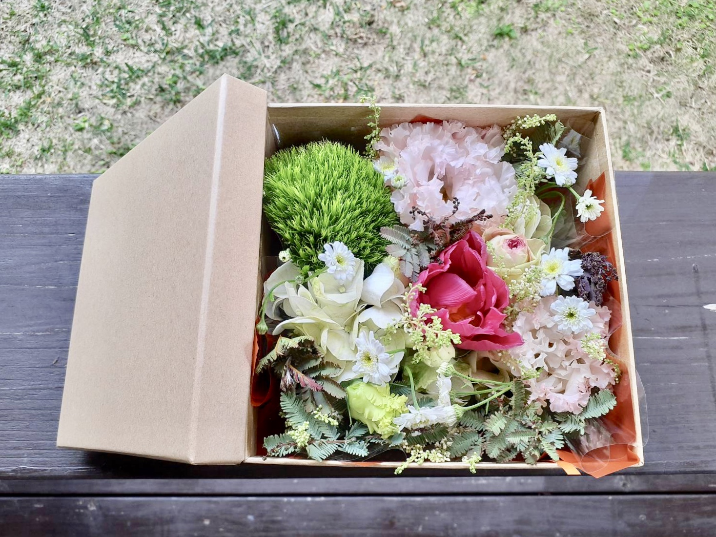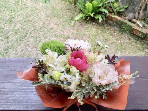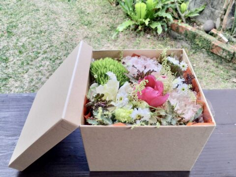 花いちりんでは生花の他に、お好みのお菓子、ドライフラワー、アクセサリー、フラワーベースをBoxやバスケットに詰めて色々な組み合わせができます。