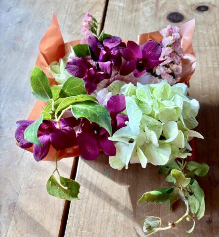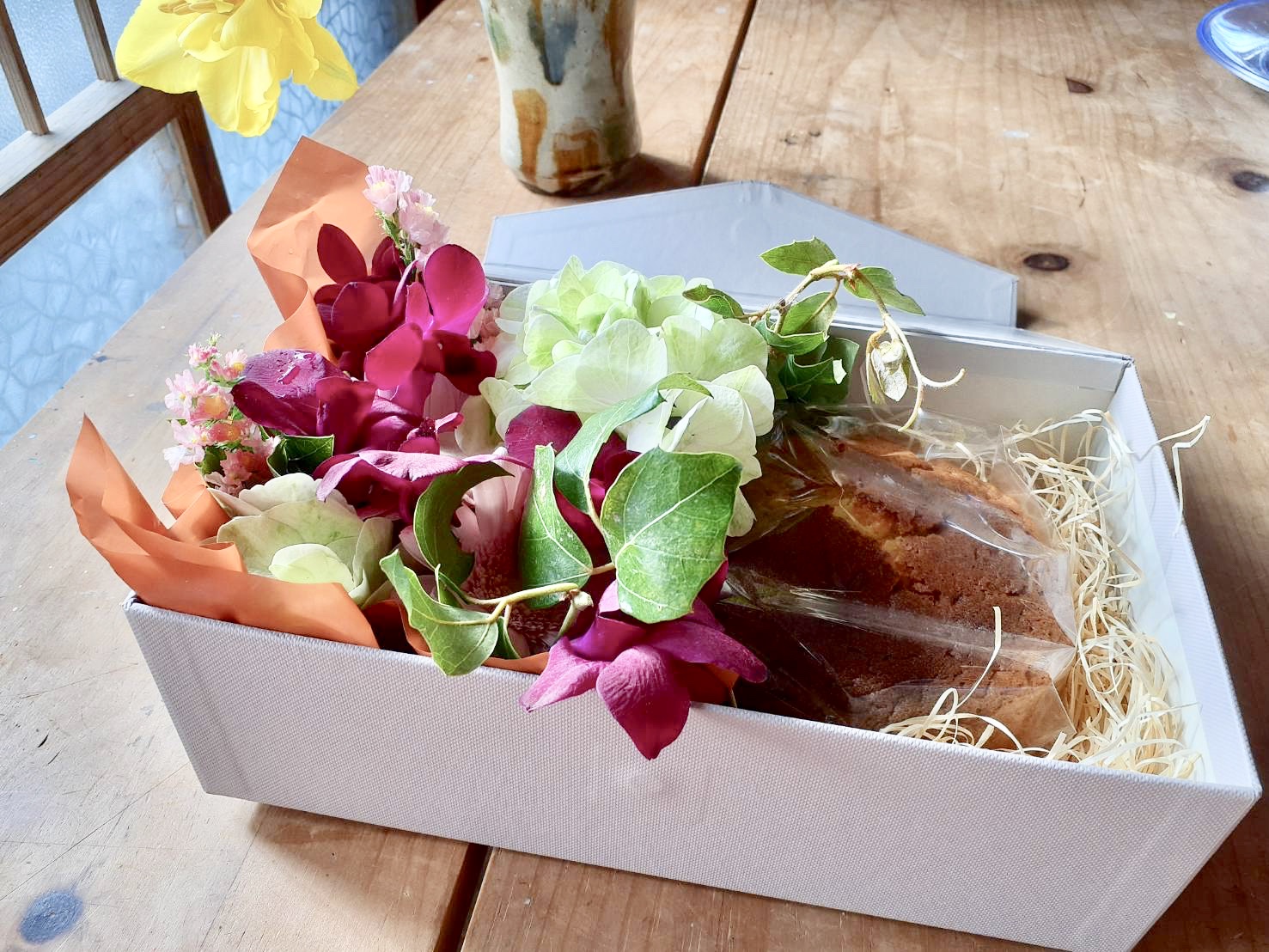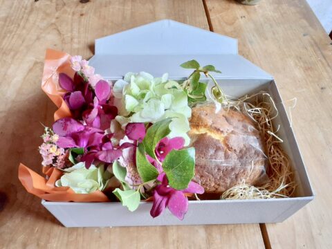久しぶりにフクロク亭さんとのコラボギフト、お花のアレンジメントとケーキのギフトボックスをご用意致しました