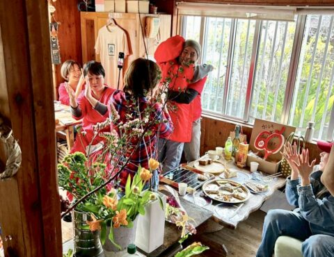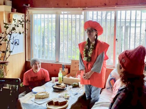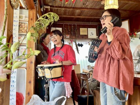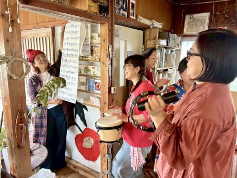 みんなで各自個人練習した、さだまさしハッピーバースデー合唱。鳴り物をミュージシャンみーきーとみのりちゃんが奏でてね