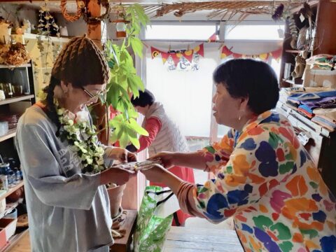 予定時間の13:30かぎやで風の音楽と共に貢物を抱えた皆さん登場!赤ちゃんちゃんことお花のレイをかけられやっと自分のパーリーだと気づくみゆこ