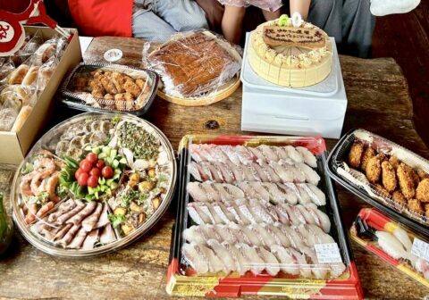 ゼブラベーグル山盛り、ゆみこが好きな鯛の握り50カン、これまたゆみこの好物カキフライ30個、野草カフェのデージ美味しいオードブル